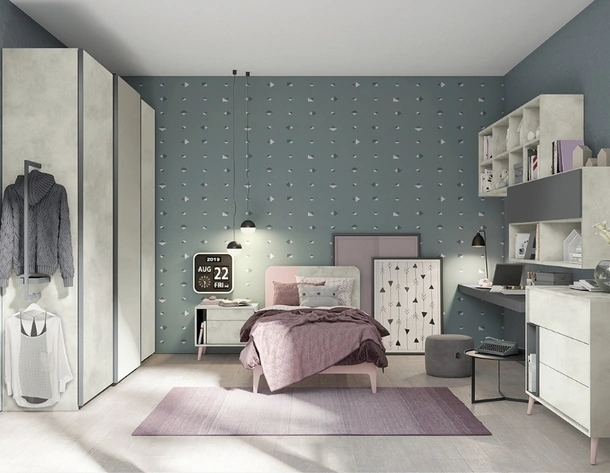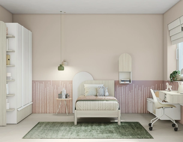 Con questa cameretta SMART Junior 12 San Martino Mobili, tra le soluzioni a ponte, potrai ammobiliare stanze moderne per bambine.